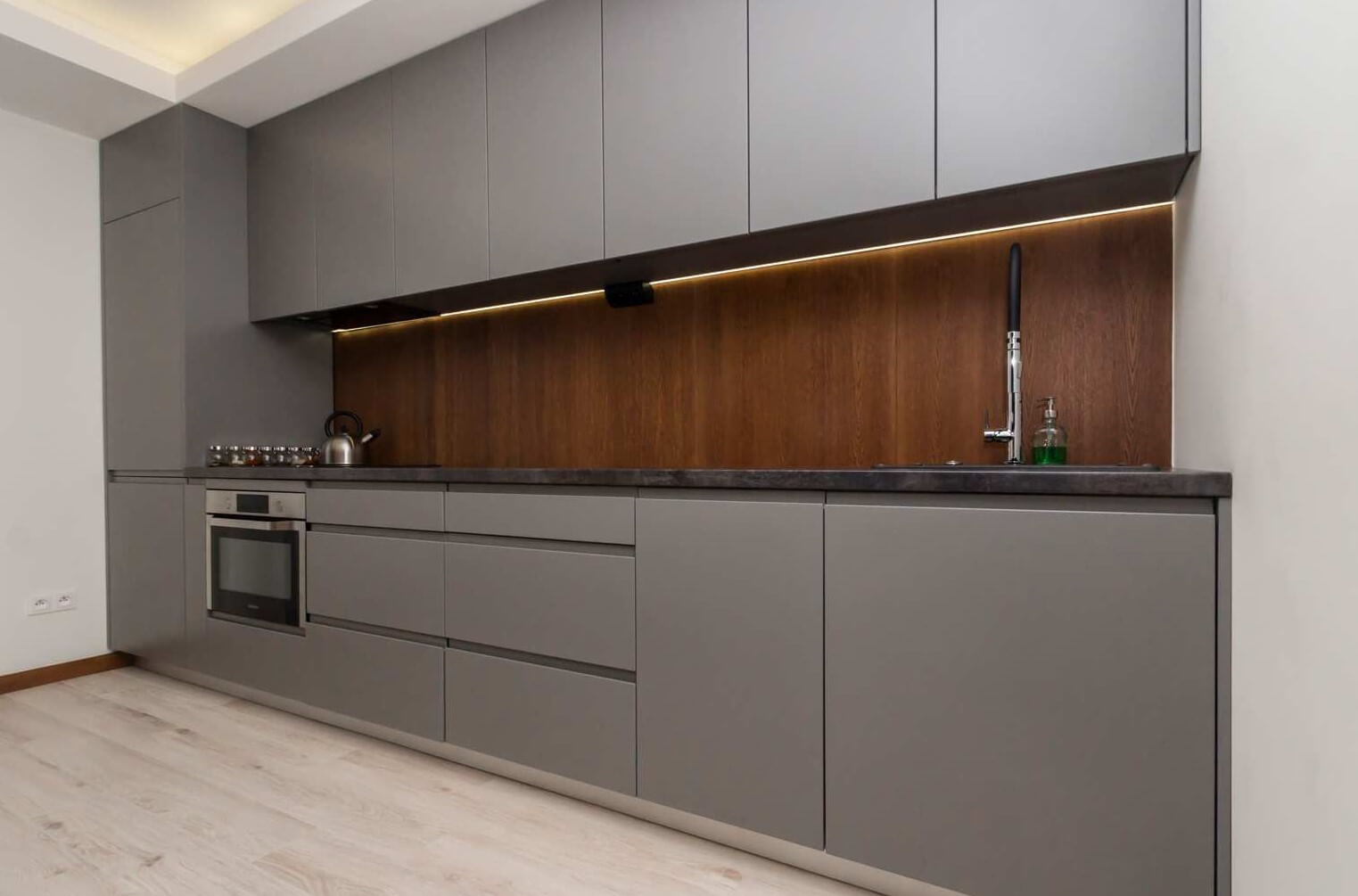 Решили обновить кухню в квартире родителей. Заказали в модном стиле хай-тек – смотрится эффектно, но при этом тепло и по-домашнему. Темный цвет однозначно добавил стиля. Все изготовили отлично – ящики выдвигаются очень плавно, ручки удобные, не хрупкие. Поверхности гарнитура матовые, не бликуют и не видно даже малейших разводов после уборки. Доставили в оговоренный срок, монтаж прошел спокойно и без грязи. Кухня получилась уютной и удобной. Могу рекомендовать, особенно для средних помещений, много места не съедает. Эта кухня на заказ самая идеальная за весь наш опыт!