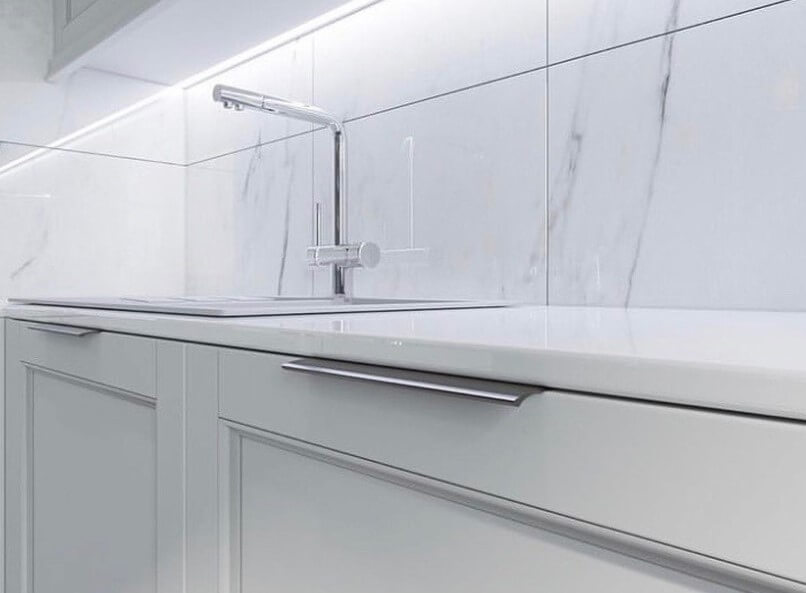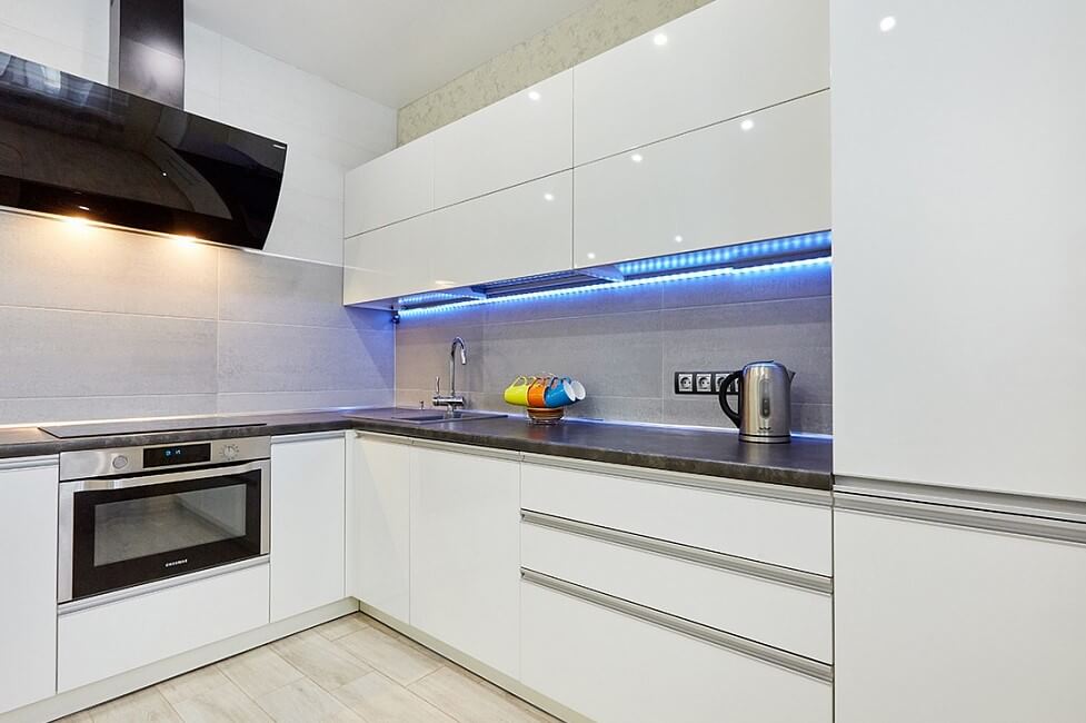 Увидела на сайте и влюбилась. Нужна была П-образная белоснежная кухня супруг, когда увидел даже не стал сопротивляться. У нас чуть не стандартный размер комнаты был, под индивидуальные размеры изготовили. После установки не могла глаз отвести, ослепляет. Остались очень довольны. Думала, что будет сложно за ней ухаживать, все таки белая, но нет, протираю и следов не остается.